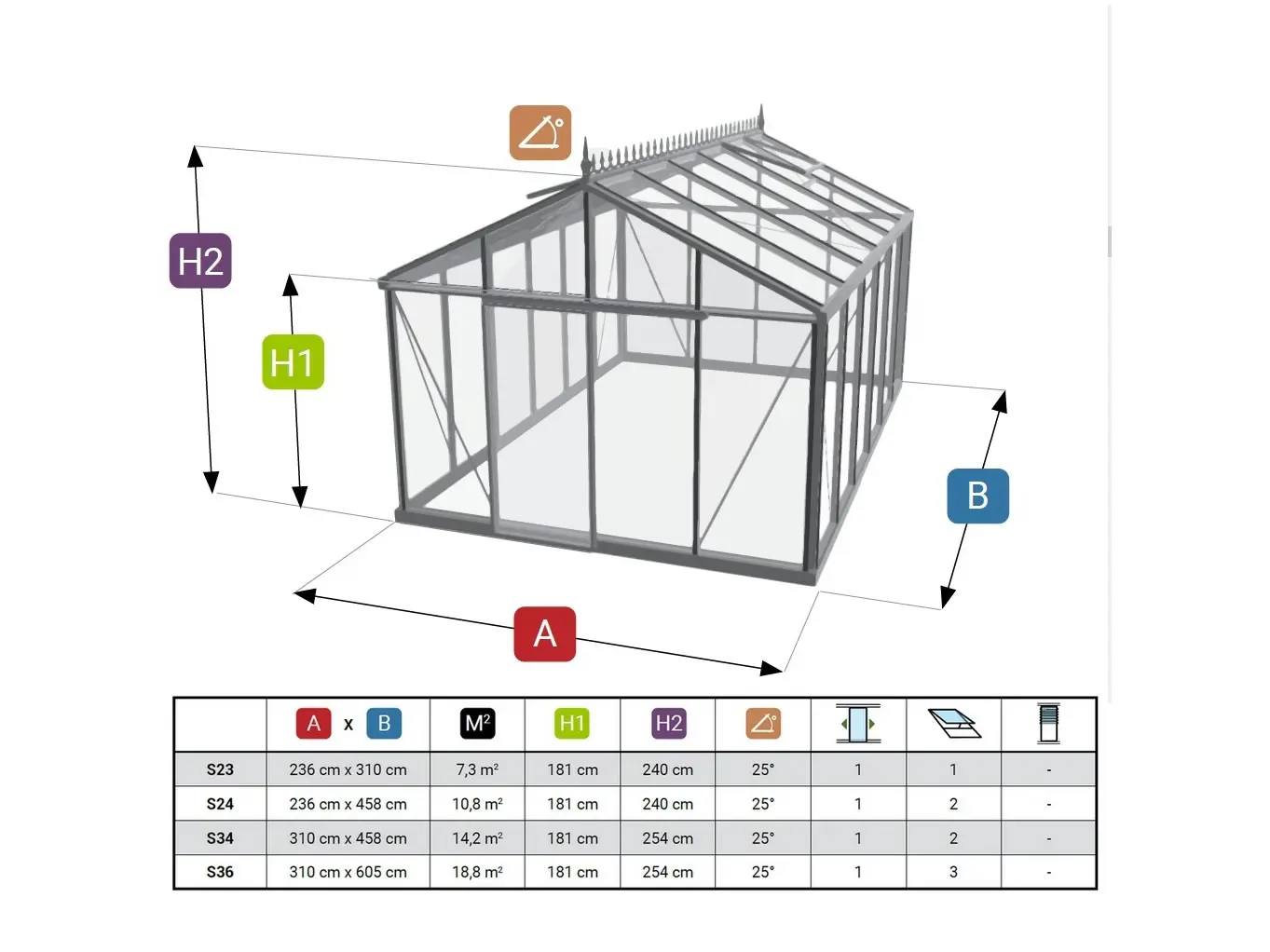 De unieke goothoogte van 181 cm zorgt ervoor dat je overal rechtop kan staan in deze ruime Helios Senior. De nokhoogte is 240 of 254 cm afhankelijk van de grootte van de serre. Alle tuinserres van Janssens worden geleverd met 4 mm veiligheidsglas, een gootprofiel met waterafvoer (40 mm) tot aan het maaiveld en een geïntegreerd stevig funderingsprofiel dat verankerd kan worden.