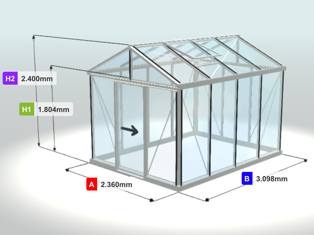Dit model heeft een afmeting van 236 x 310 cm, waardoor je een werkoppervlakte van 7,3 m² tot je beschikking hebt. De breedte-diepte verhouding van 3 x 4 ruiten zorgt voor een ruime en praktische indeling.