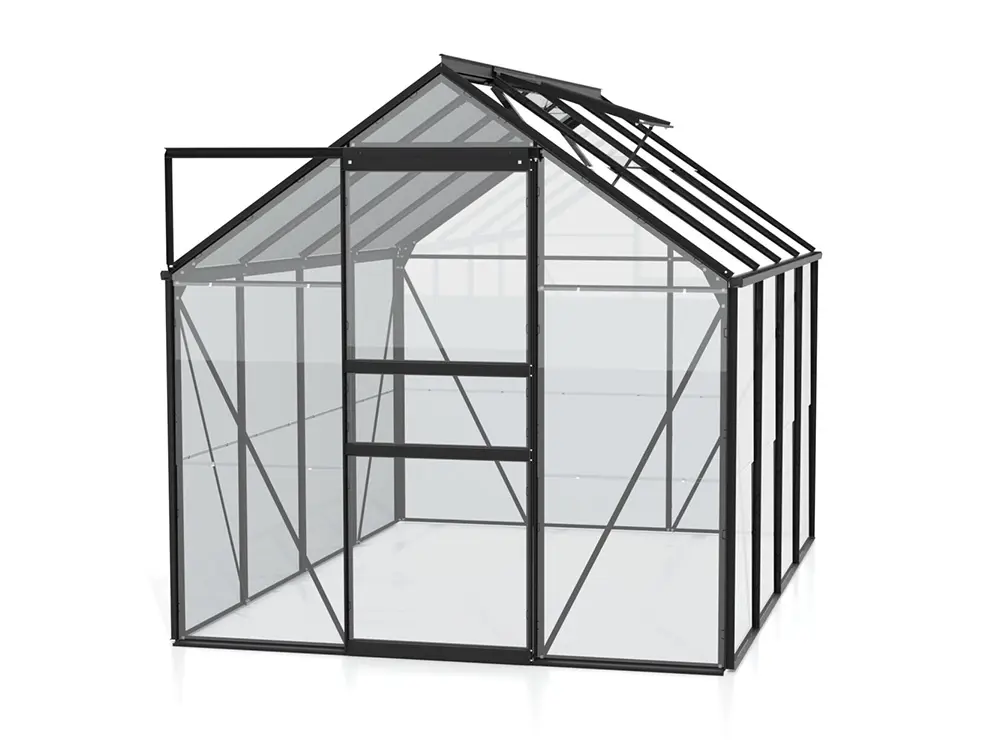 Deze kwalitatieve tuinkas is gemaakt van poedergecoat zwart aluminium en is standaard voorzien van veiligheidsglas, wat zorgt voor een luxueuze en moderne look! Dankzij de schuifdeur, die naar wens links of rechts te plaatsen is, geniet je van optimaal gebruiksgemak en flexibiliteit. Afhankelijk van het formaat heeft de serre één of twee dakramen voor een goede ventilatie en wordt de structuur extra verstevigd met daksteunen.