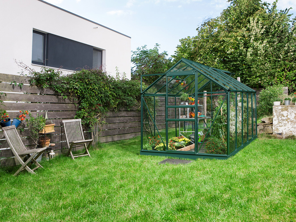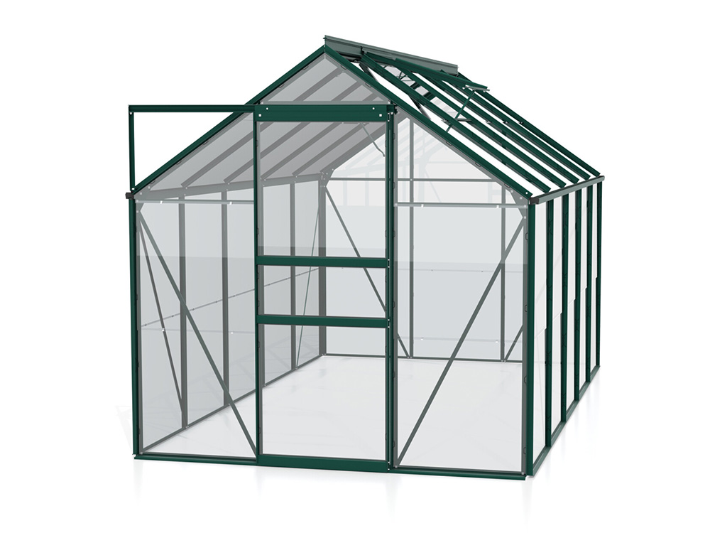 Deze kwalitatieve tuinkas is gemaakt van poedergecoat groen aluminium en standaard voorzien van veiligheidsglas, wat zorgt voor een langdurige, mooie uitstraling. De groene kleur gaat perfect op in de tuin! Dankzij de schuifdeur, die naar wens links of rechts te plaatsen is, geniet je van optimaal gebruiksgemak en flexibiliteit. Afhankelijk van het formaat heeft de serre één of twee dakramen voor een goede ventilatie en wordt de structuur extra verstevigd met daksteunen.
