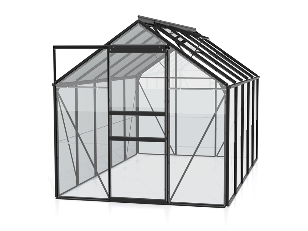 Deze kwalitatieve tuinkas is gemaakt van poedergecoat zwart aluminium en is standaard voorzien van veiligheidsglas, wat zorgt voor een luxueuze en moderne look! Dankzij de schuifdeur, die naar wens links of rechts te plaatsen is, geniet je van optimaal gebruiksgemak en flexibiliteit. Afhankelijk van het formaat heeft de serre één of twee dakramen voor een goede ventilatie en wordt de structuur extra verstevigd met daksteunen.