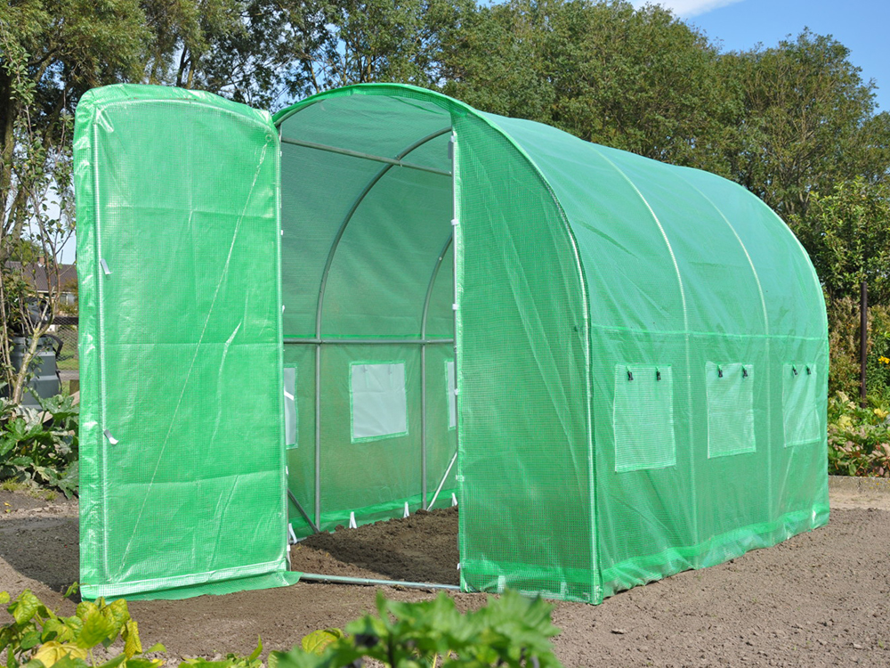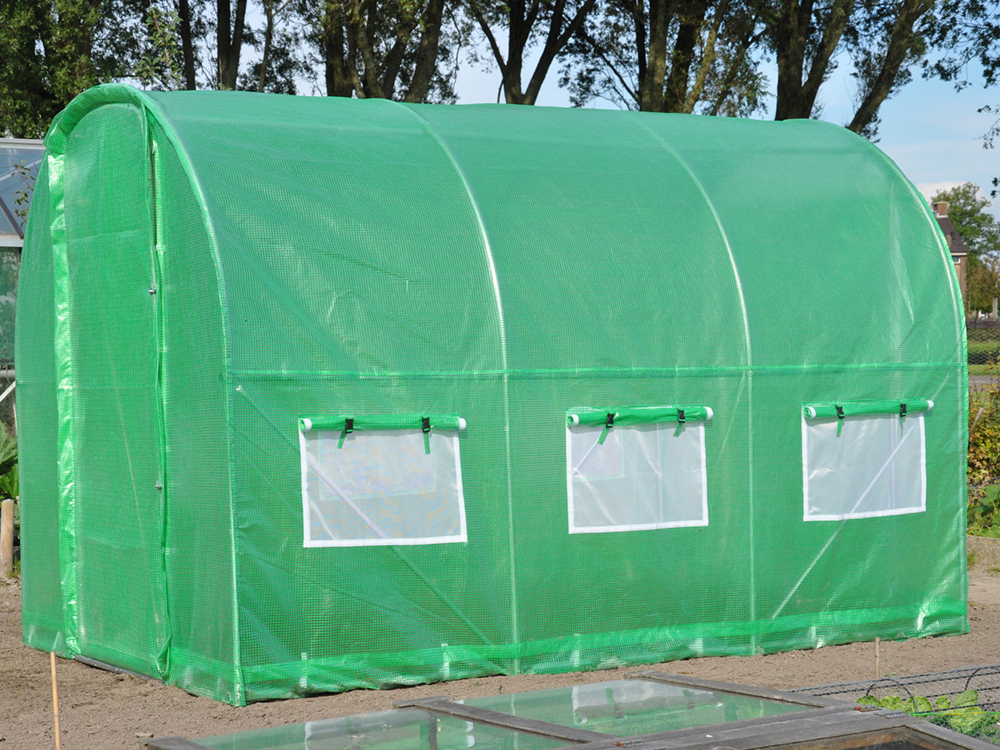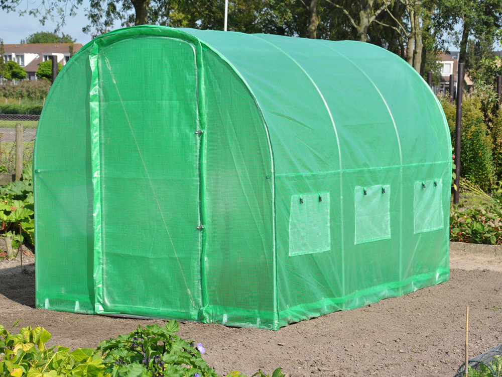 De tunnelkas bestaat uit een verzinkt stalen constructie van buizen met een diameter van 25 en/of 32 mm. Het frame wordt overspannen met een frisgroene UV-bestendige en gewapende folie dat diffuus groeilicht doorlaat. Ideaal voor de beplanting in de serre. De toegang is dankzij de hoogte van 2 meter en een stalen draaideur optimaal.
