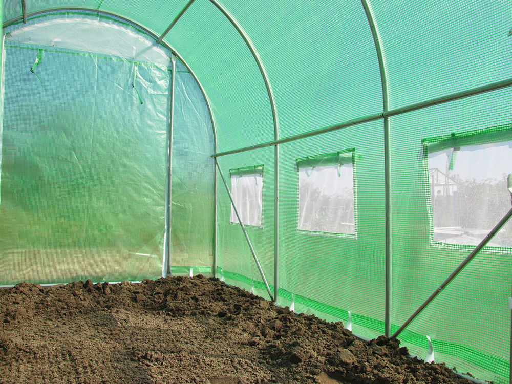 Het verankeren aan de ondergrond gebeurt door het ingraven van de 50 cm lange folieflap aan de onderzijde van de kas. Voor een goede beluchting is deze tunnekas voorzien van 6 individuele met klittenband afsluitbare horrengaas ramen in de zijgevels en één raam in de achtergevel.