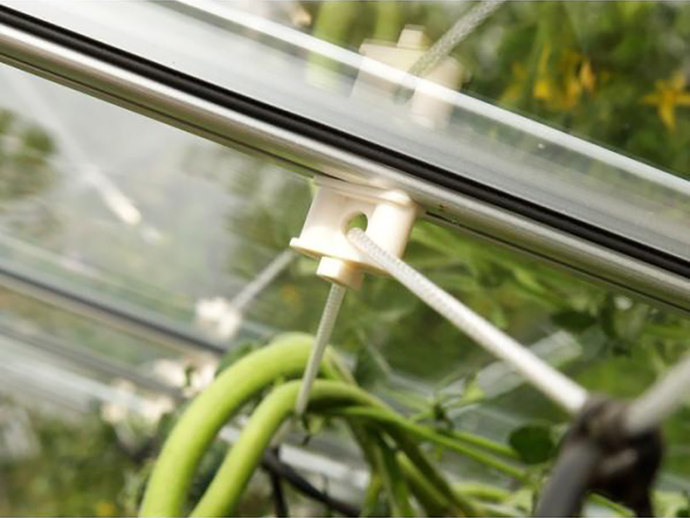 Dankzij de kantelboutkop past de schroefhaak in de gleuf van het serre- of kasprofiel en is het geschikt voor verschillende toepassingen. Zo kan je er bijvoorbeeld eenvoudig de steundraad voor de geleiding van tomaten en andere planten aan bevestigen.