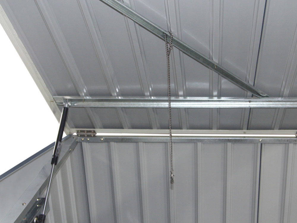 De berging is voorzien van twee opendraaiende deuren aan de voorzijde en een deksel met gasveer, waardoor het openen en sluiten van de berging gemakkelijk gaat. Dankzij het eenvoudige design past de Polly B berging perfect in elke tuin.