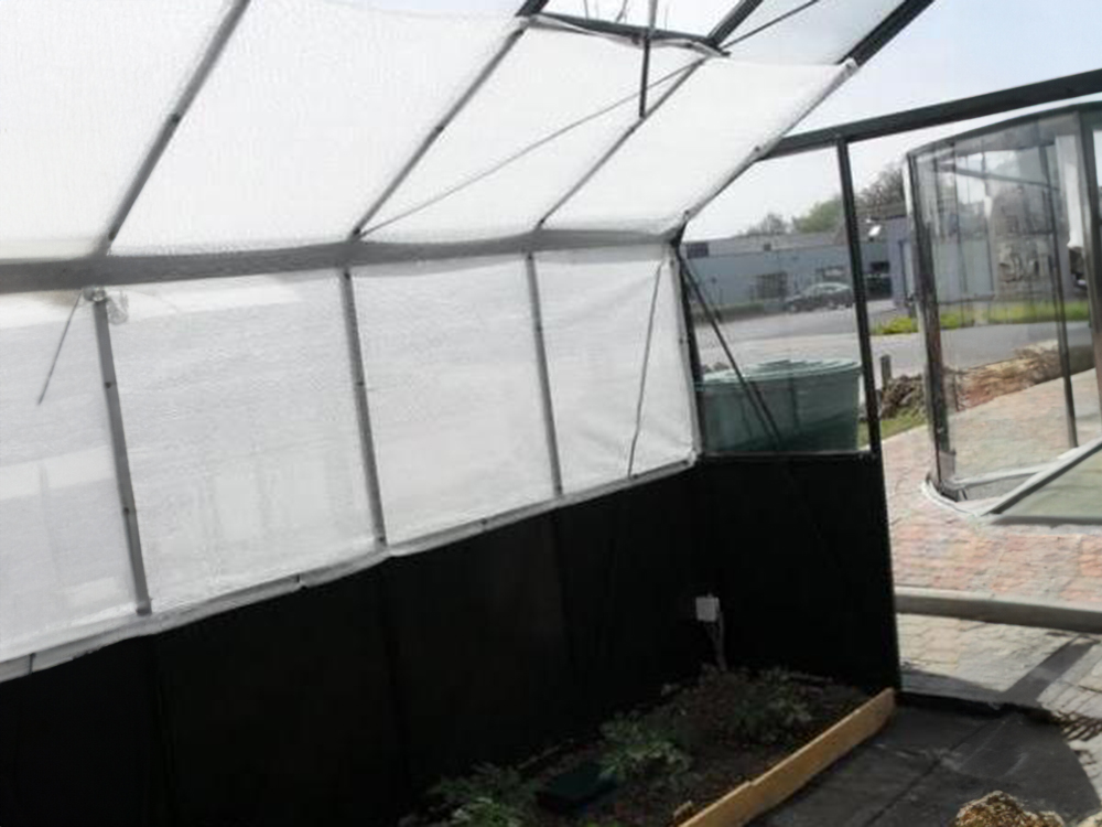 Schaduwdoek, schermgaas of schermdoek tegen de zon. Het witte schaduwdoek houdt 60% van het licht tegen. Om ervoor te zorgen dat de temperatuur in je serre niet te hoog oploopt, om bepaalde planten te beschermen tegen verbranding en verkleuring, of om uitdroging te voorkomen, is een goede afscherming belangrijk.