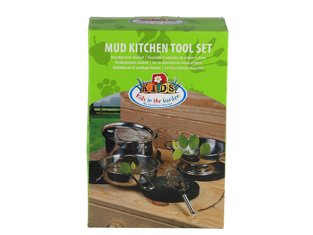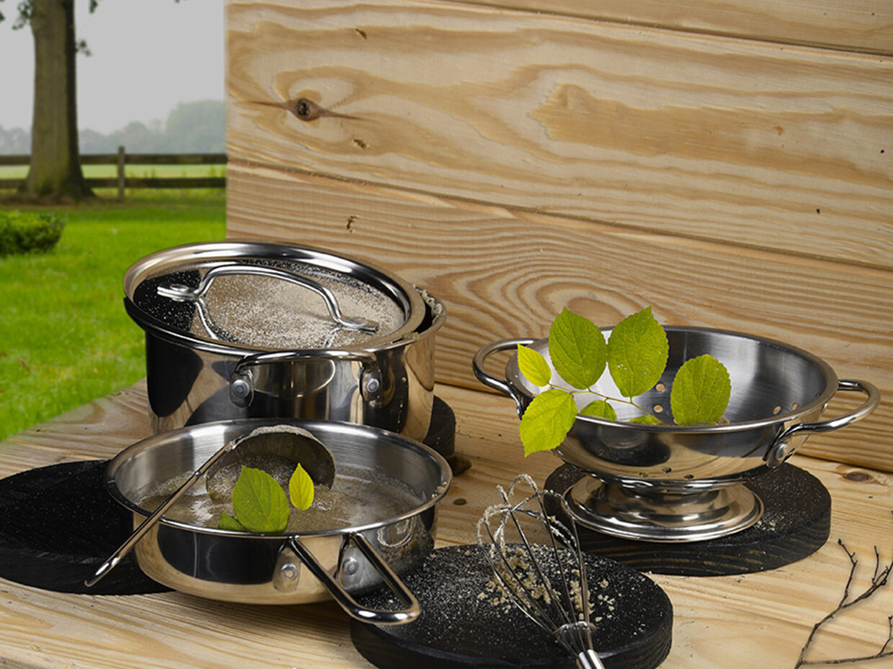 Buitenspelen met de modderkeuken wordt pas echt een feest met ons speciaal ontworpen modderkeuken kookset. Hiermee kunnen de kleine modderchefs de lekkerste moddergerechten bereiden. Het set bestaat uit 2 pannen, een deksel, een vergiet, een lepel en een garde - alles wat ze nodig hebben voor een smakelijke moddermaaltijd!