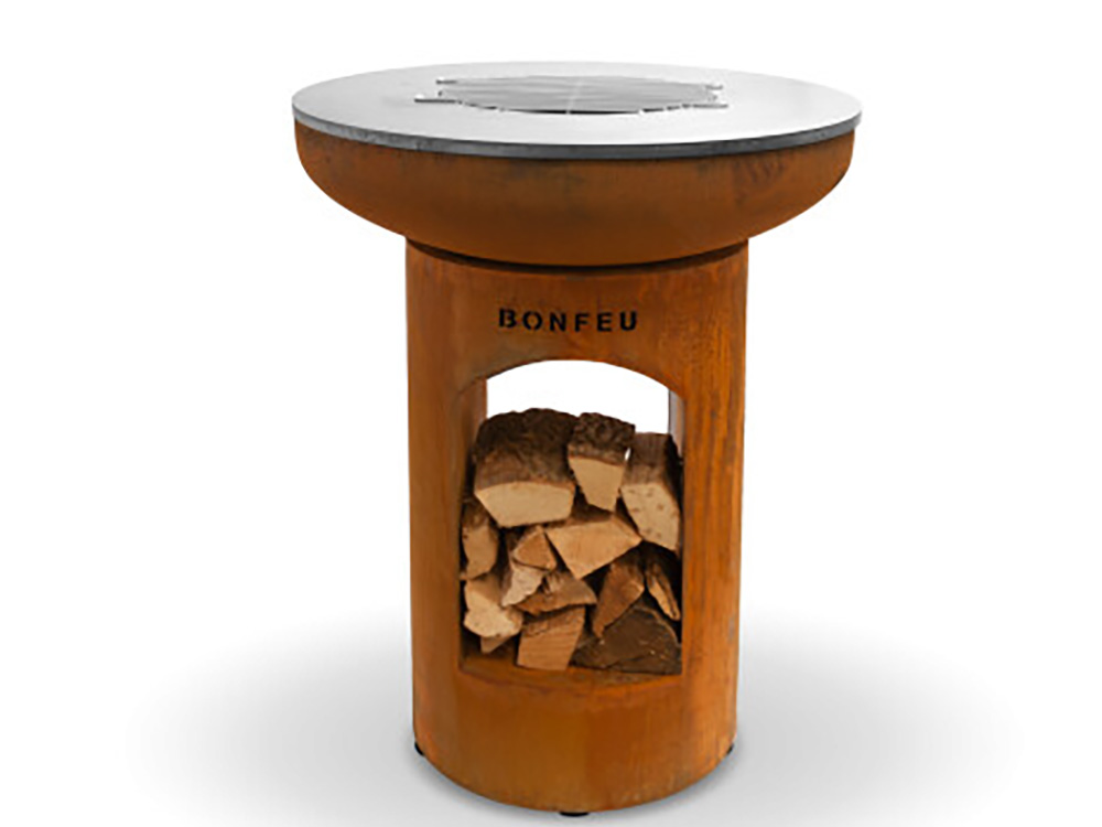Bonfeu brengt met zijn Brasero Bonbiza Open met houtopslag, sfeer in elke tuin of op elk terras. Deze multifunctionele vuurschaal verspreidt zijn warmte op aangename wijze dankzij het onderstel met houtopslag op 75 cm hoogte.