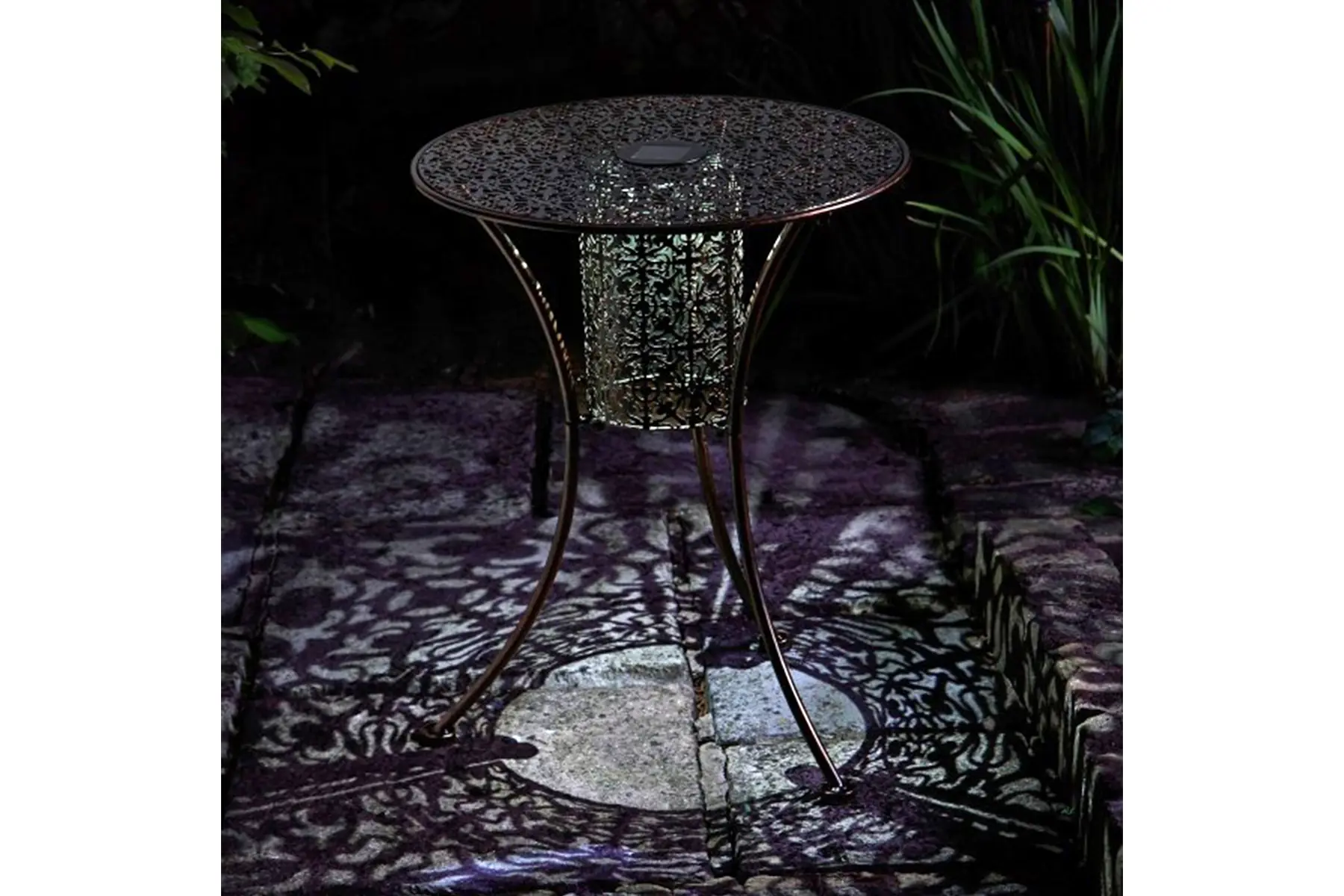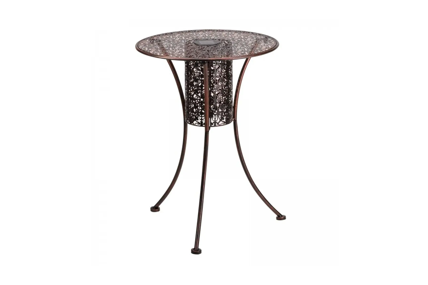 Deze leuke bijzettafel in sierlijk metaal heeft een centraal ingebouwd zonnepaneeltje in het tafelblad dat de bijhorende batterij oplaadt in vol zonlicht. Dit zorgt ervoor dat de tafel prachtig oplicht wannneer de avond valt!