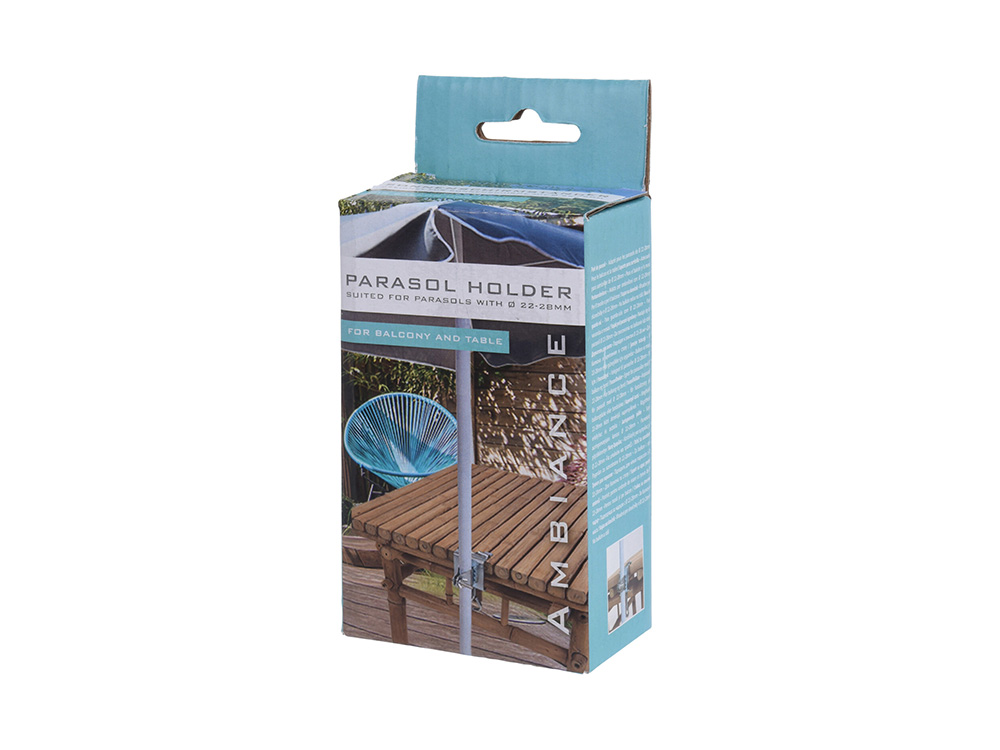 Geen plaats voor een zware parasolvoet op jouw balkon of (dak)terras? Met deze houder zet je jouw parasol handig vast aan de reling van een balkon of aan een tuintafel. Door zijn stevige uitvoering, kan de parasol ook wat wind aan.