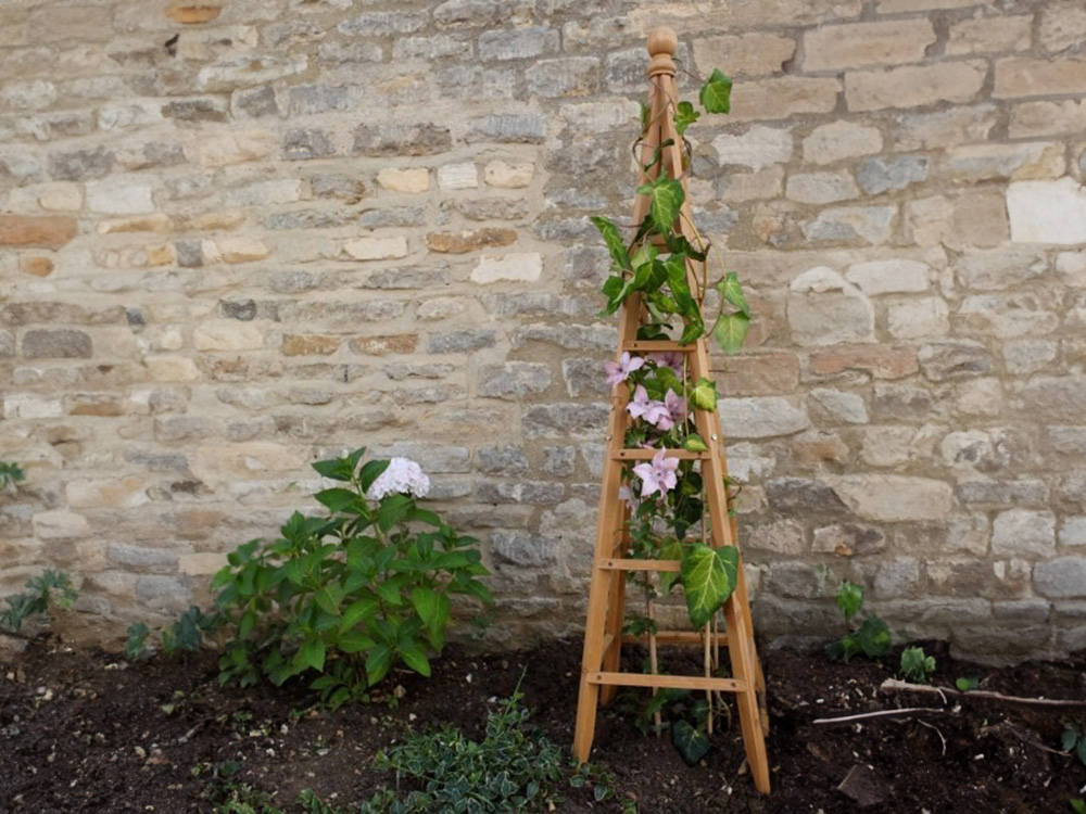 Deze houten plantensteun heeft een piramidale vorm en is de geschikte geleider voor klimplanten of vaste planten die de neiging hebben om te vallen.