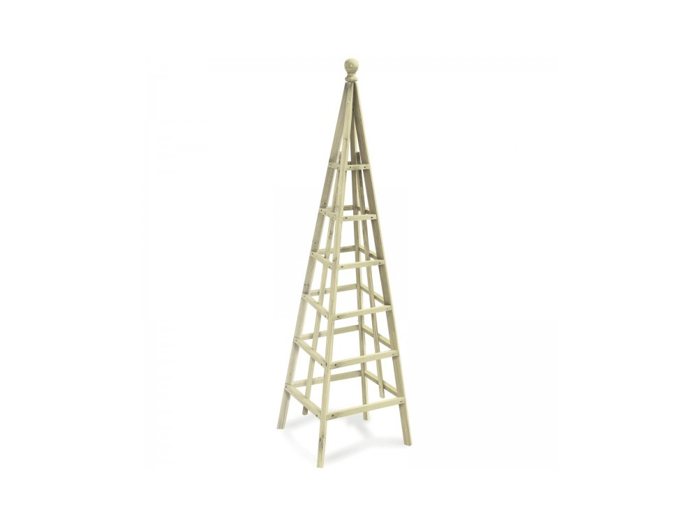 De obelisk is gemaakt van robuust dennenhout en kan ook in bloempotten of plantenbakken als bloemensteun dienen. De top is mooi afgewerkt met een grenenhouten bolvorm.