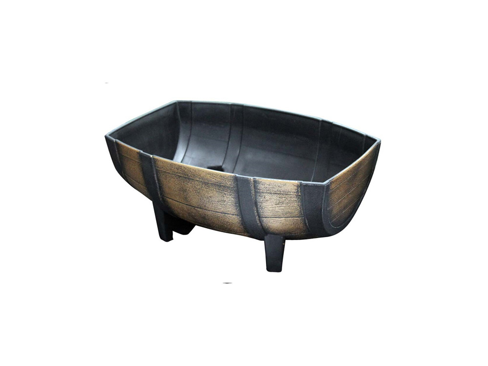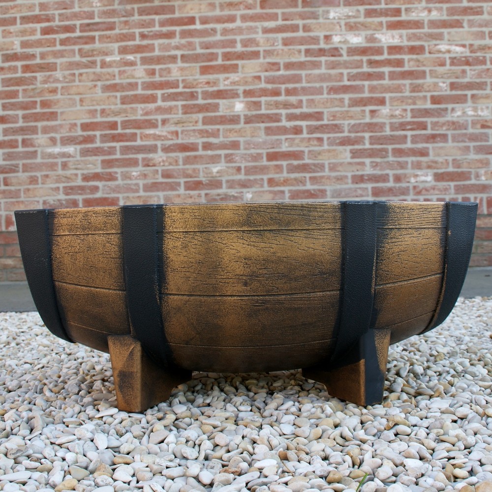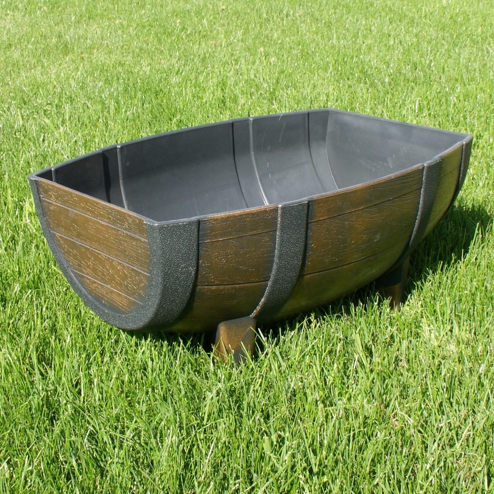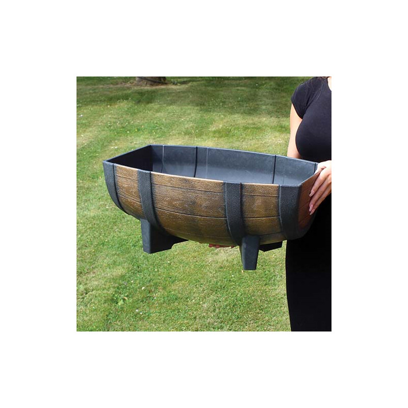 Plantbak in de vorm van een traditioneel half houten wijnvat. Deze bloembak is gemaakt van duurzaam kunststof en oogt mooi en rustiek dankzij de goedgevormde imitatie van een eikenhouten vat.