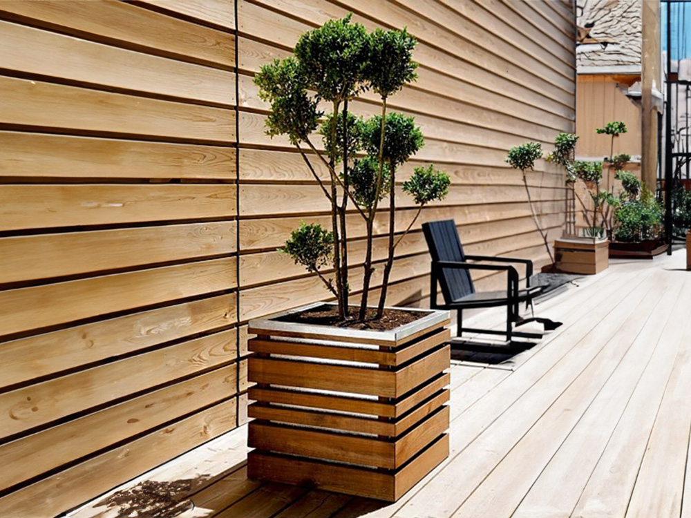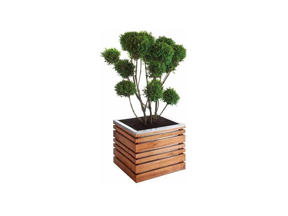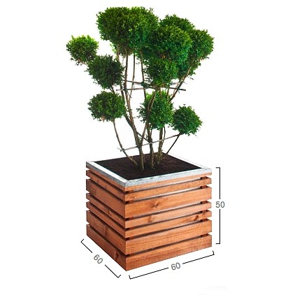 Mooie vierkante bloembak in hout. Deze houten plantenbak oogt modern omwille van de leuke combinatie van geïmpregneerd grenenhout en verzinkt metaal. De verzinkte plantenbak past bovenin de houten constructie en zorgt voor een mooi afgewerkte verzinkte bovenrand. Bovendien is de verzinkte bak zichtbaar doorheen het houtwerk.