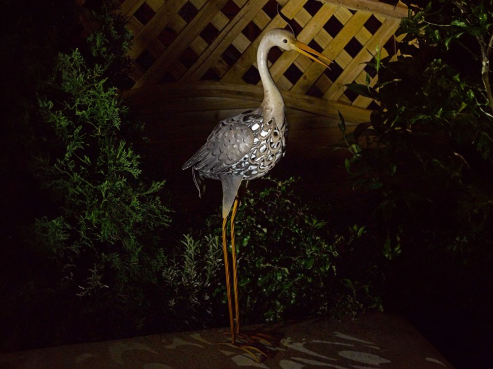 De reiger is voorzien van verlichting op zonne-energie die bij schemering een mooie gekleurde lichtgloed geeft. De ingebouwde heroplaadbare batterij wordt overdag via de geïntegreerde zonnecel op de rug van de vogel opgeladen en zorgt in het donker voor de nodige stroom. Wanneer de schemering valt, verandert het ledlicht om de paar seconden van kleur, van rood over blauw naar groen.