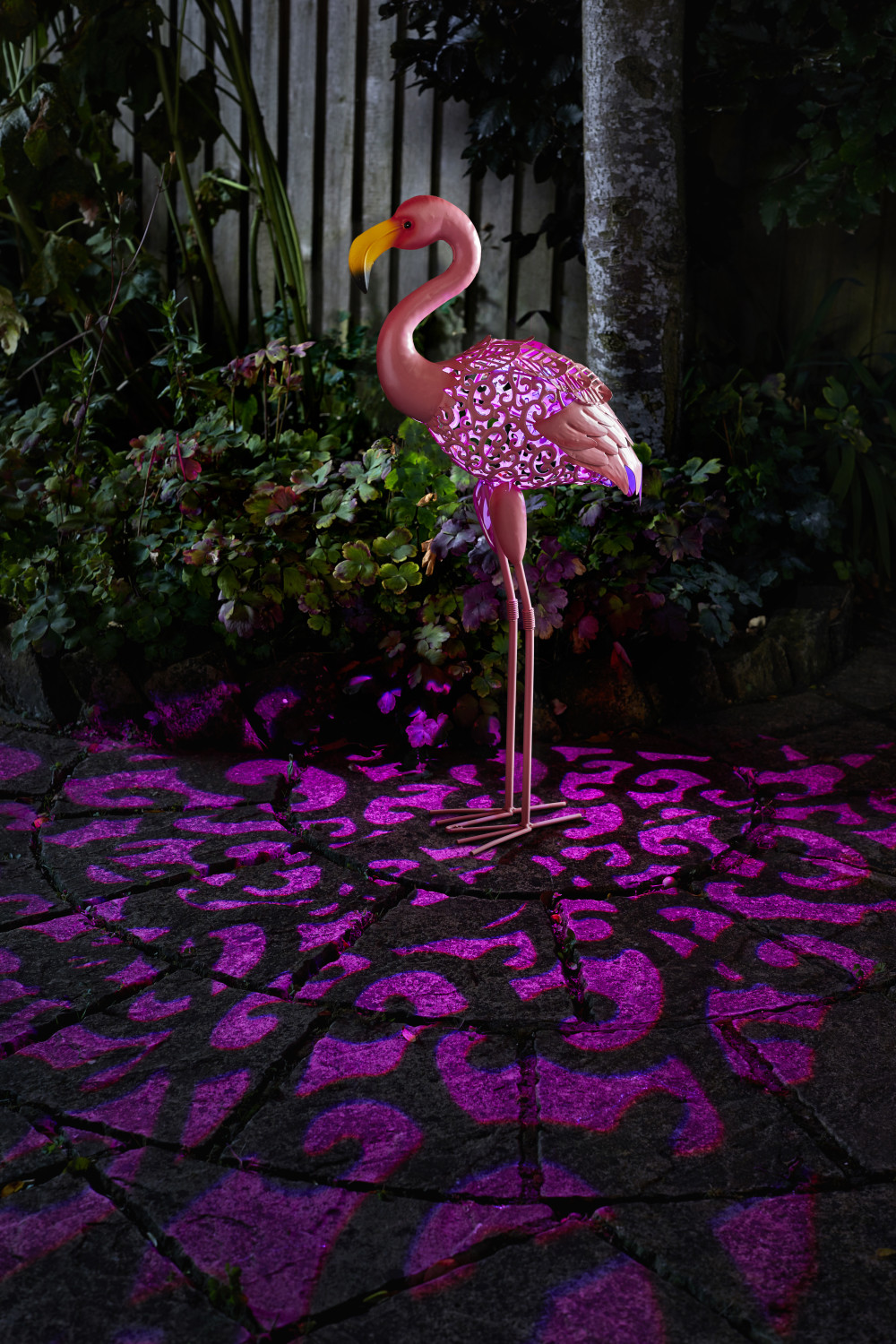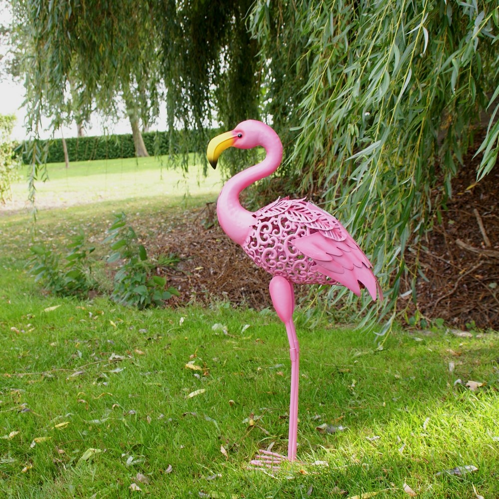 Deze tropische vogel is gemaakt uit metaal met extra aandacht voor het kleurenpalet. Overdag is het een mooie tuindecoratie en het wordt een charmant sfeerlicht wanneer de avond valt. 's Avonds bij donker ontstaat er een mooi schaduwpatroon op de grond als het licht doorheen het sierlijke lijf van de flamingo schijnt.