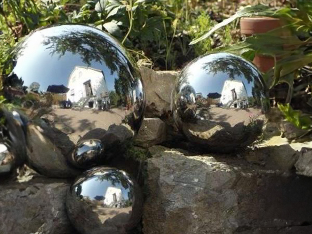 Tegenwoordig zie je deze spiegelende bollen steeds vaker in tuinen, niet meer om heksen te verjagen, maar vanwege hun esthetische waarde. De bol weerspiegelt het volledige panorama van de tuin, en geplaatst bij een vijver, schrikt de lichtweerkaatsing reigers af.