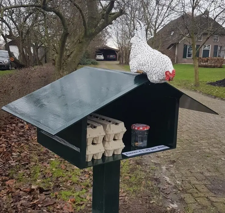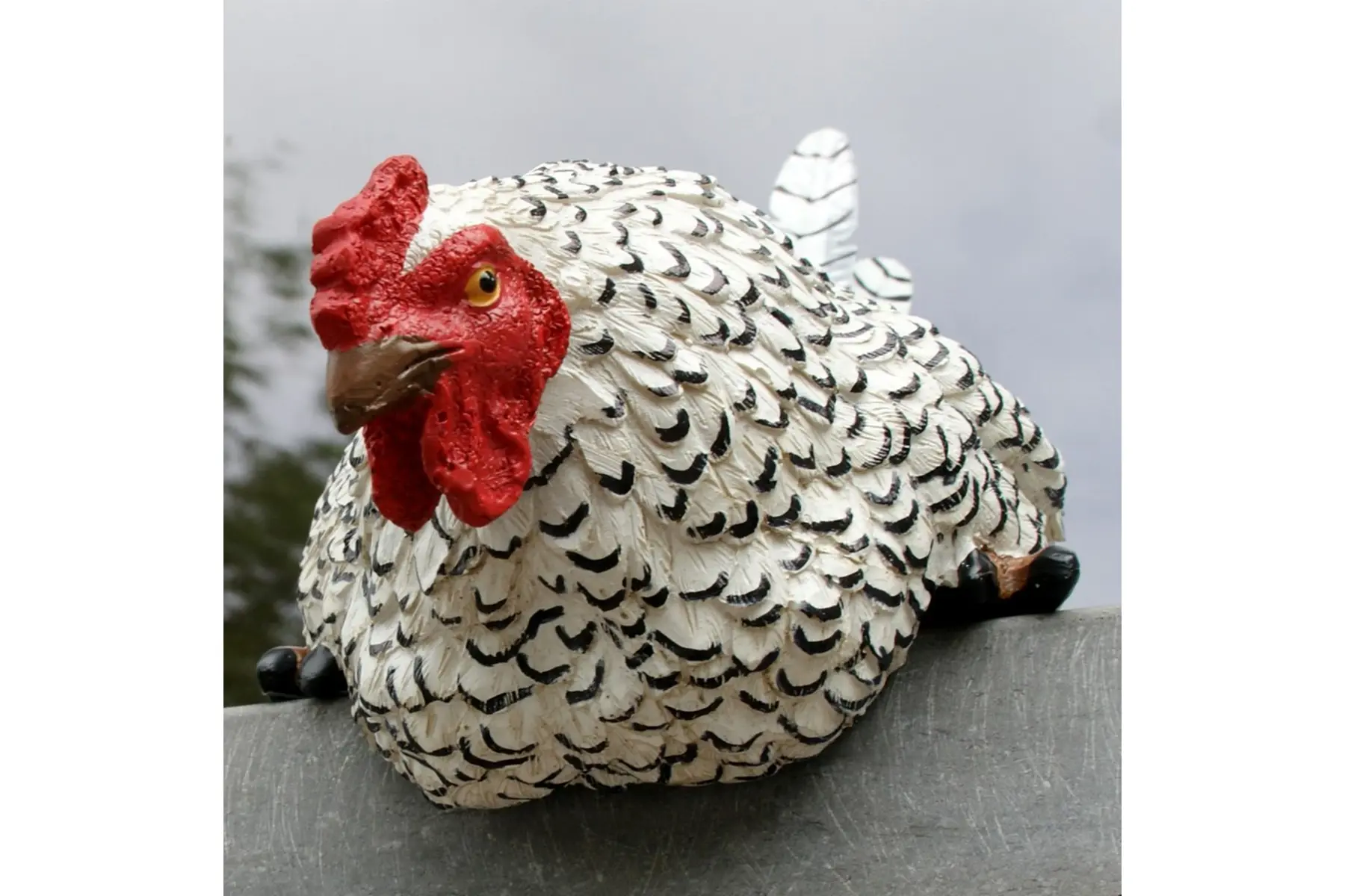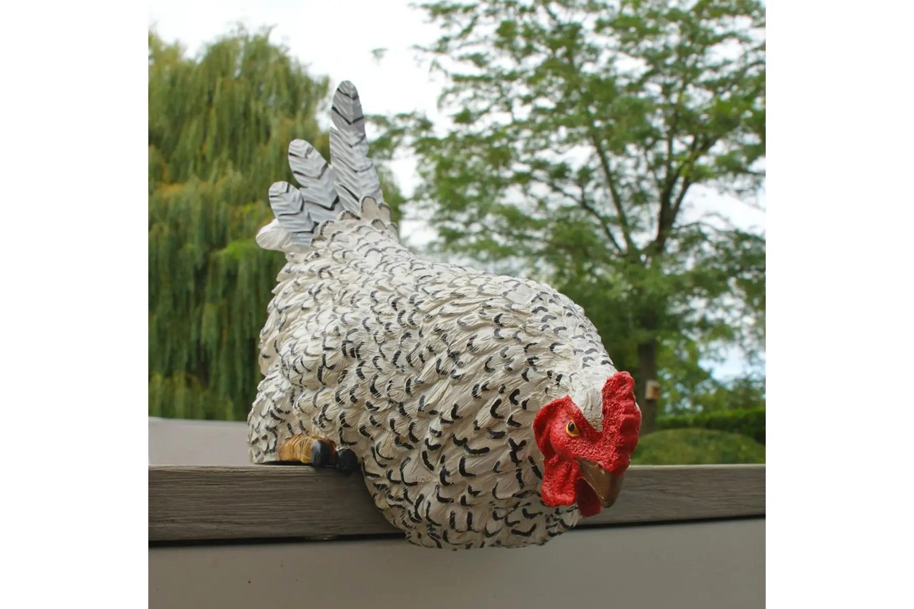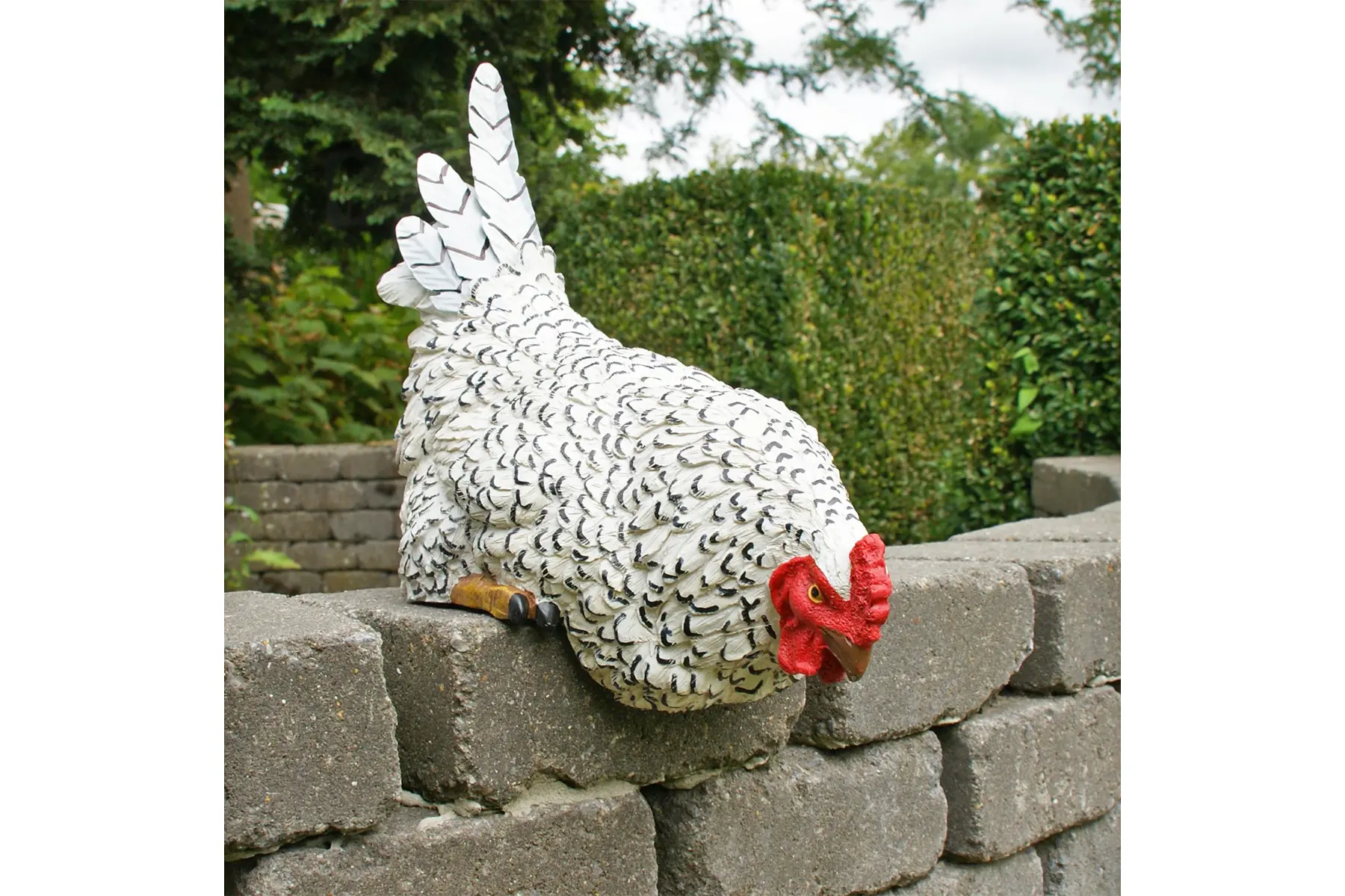 Deze nieuwsgierige kip gluurt als het ware over de rand van jouw tuinmuur, kippenren, tuintafel of keukenkast. Het wit verenkleed met zwarte accenten, de rode kop en unieke vorm maken van deze kip een origineel beeld.