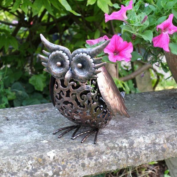 Uil in metaal met verlichting op zonne-energie