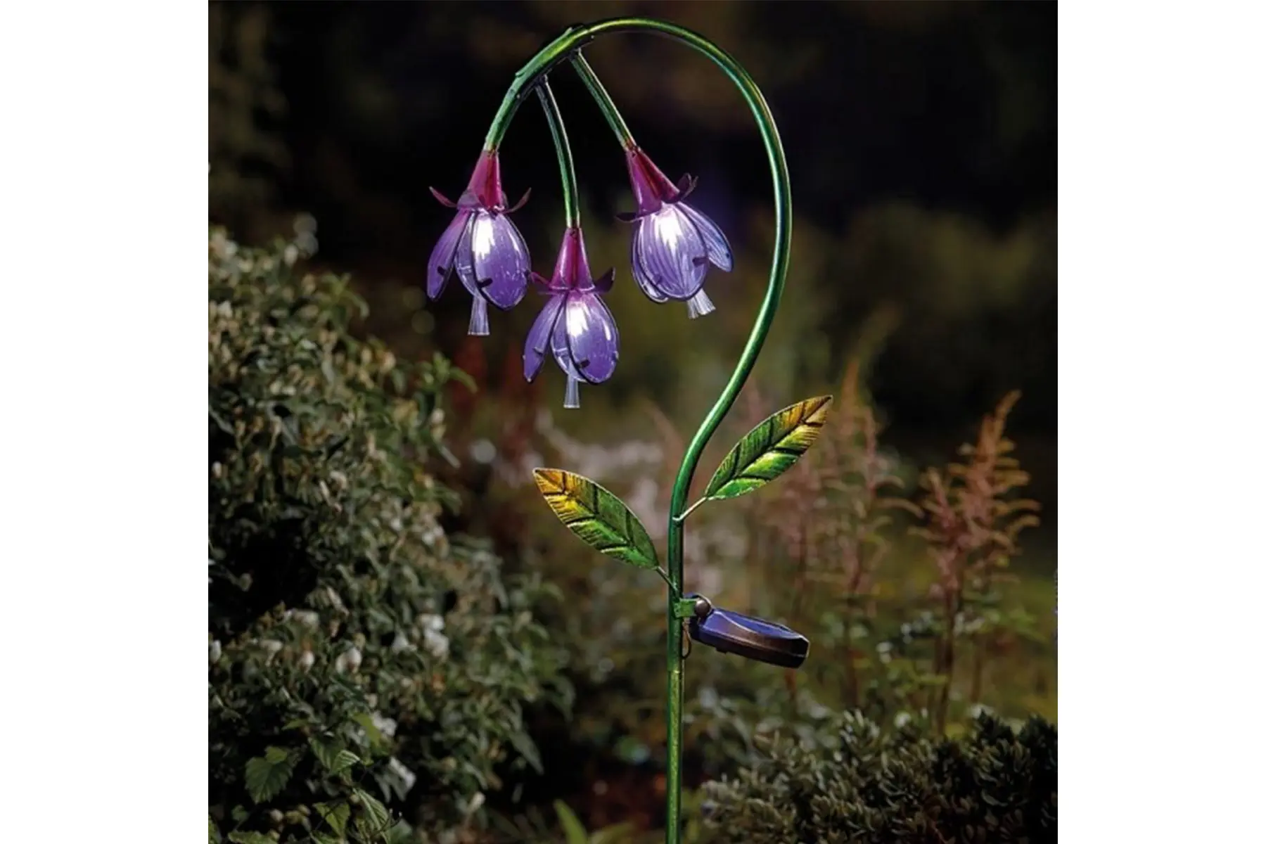 Deze bellenplant met drie paarse handgeschilderd glazen bloemen heeft een stevige metalen constructie in opvallend mooie kleuren. De verlichting gaat automatisch aan eens het donker wordt.