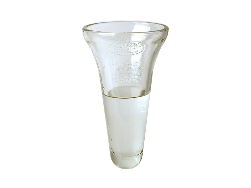 De hoeveelheid neerslag is eenvoudig af te lezen op deze stevige glazen maatbeker. Om verdamping zoveel mogelijk te voorkomen, is het belangrijk om de neerslag minimaal eenmaal per dag te meten.