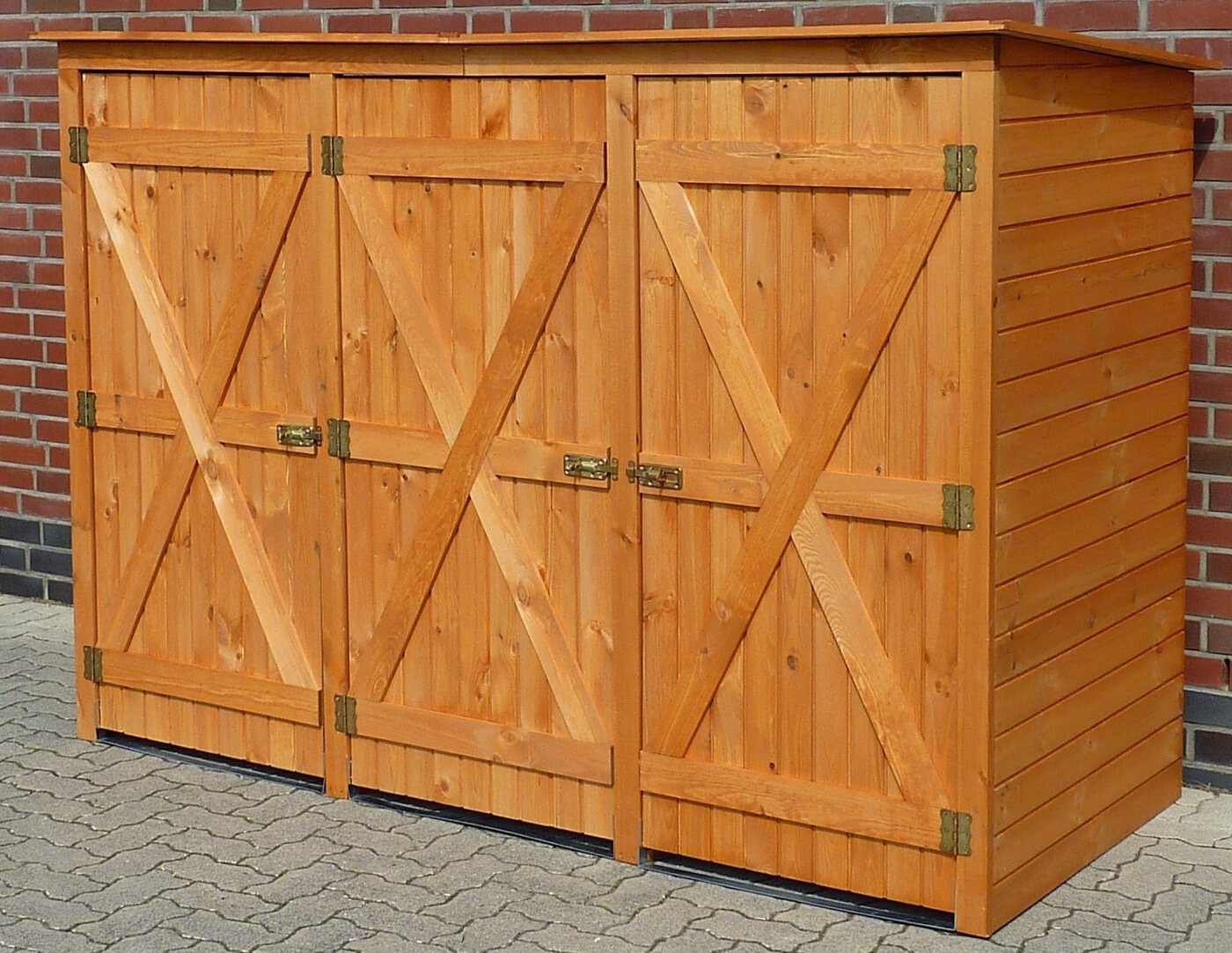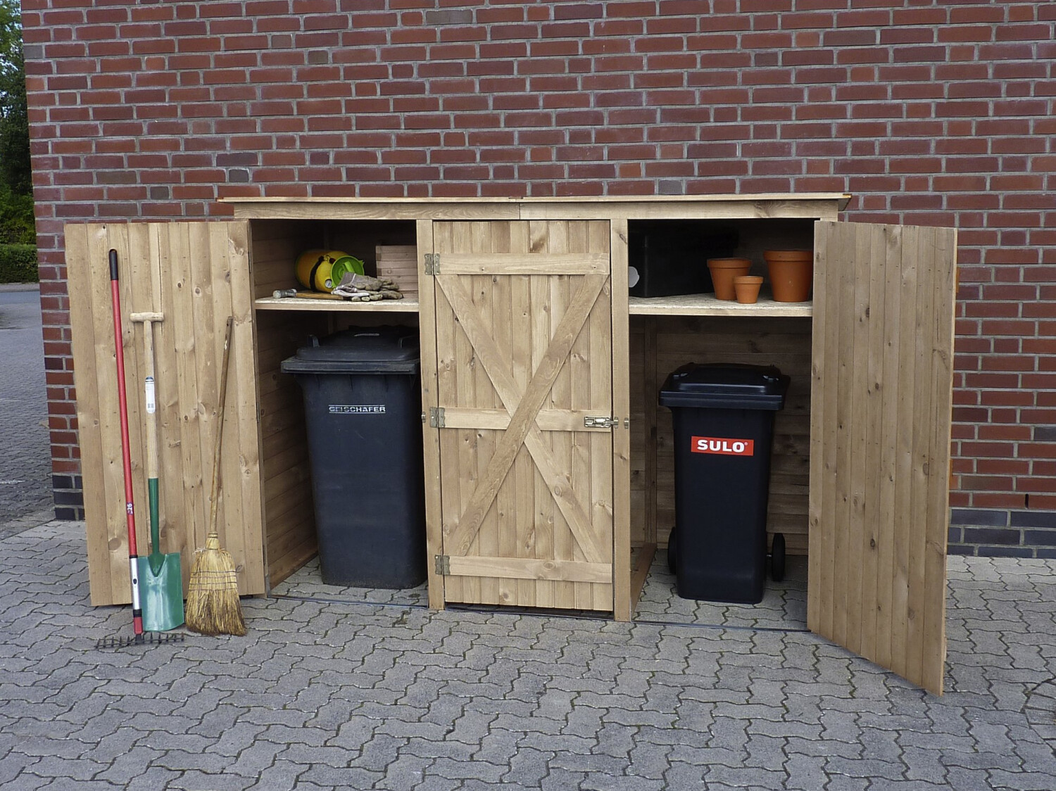 Met deze mooie houten berging kan je voortaan de niet zo fraai uitziende afvalcontainers netjes opbergen. De ruime kast biedt plaats aan maar liefst 3 containers. Daarenboven is het schap in elke ruimte ideaal om allerlei tuinbenodigdheden te stockeren. Doordat het schap verstelbaar is, kan de berging ook voor andere doeleinden gebruikt worden.