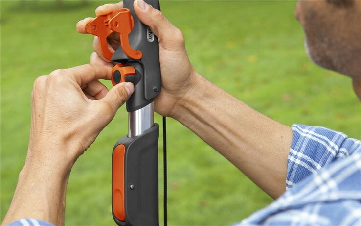 De aluminium telescoopsteel is bijzonder licht en stabiel. De steel heeft een ovale vorm voor meer stabiliteit en om verdraaiing tijdens het verstellen te voorkomen. Een demper voorkomt ook het onbedoeld intrekken zodat er geen verwondingen kunnen ontstaan. De vaste bevestigingsschroef met zachte kunststof garandeert een trek- en torsiebestendige verbinding tussen steel en gereedschap.